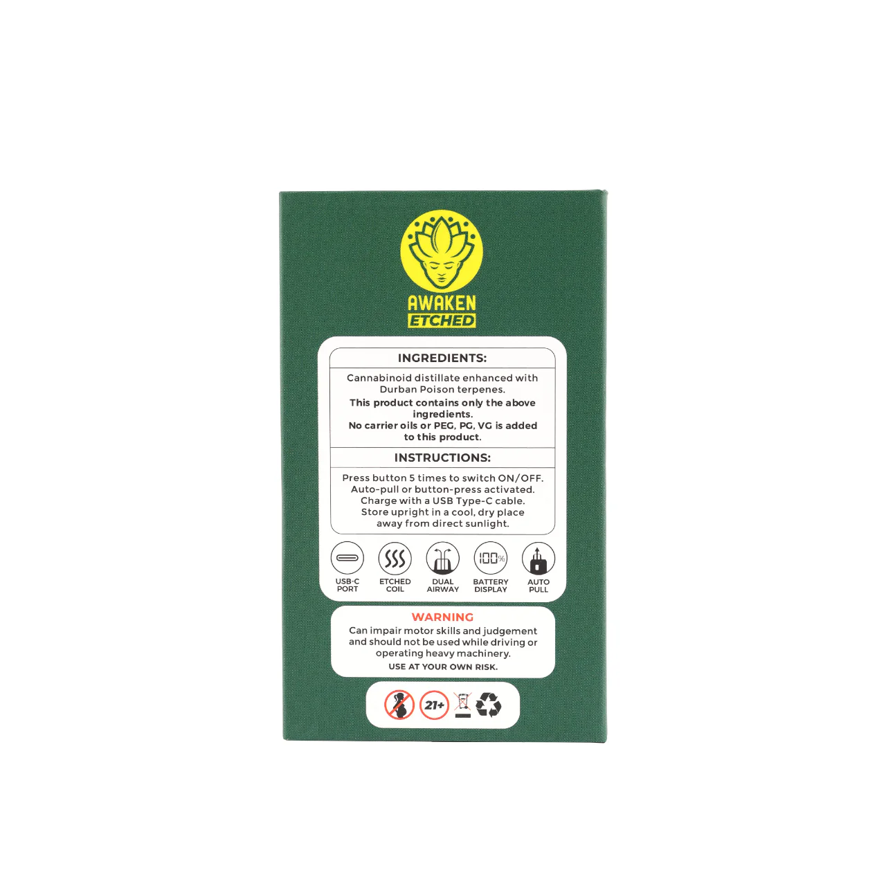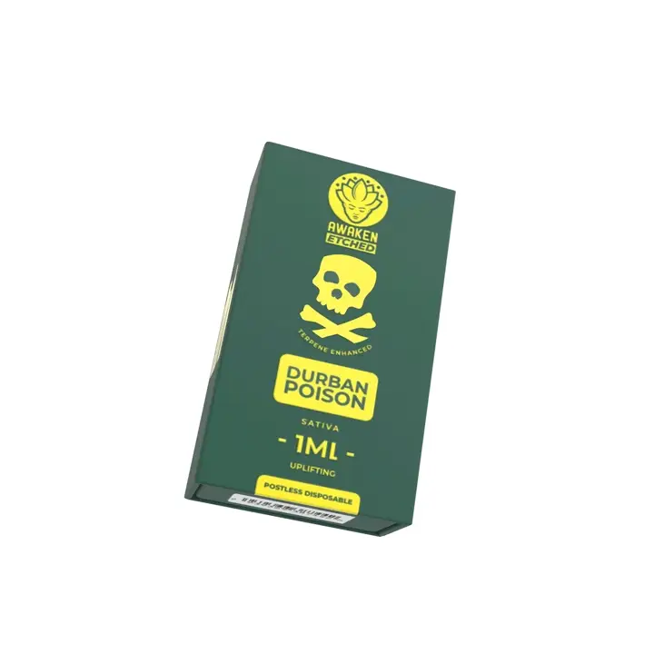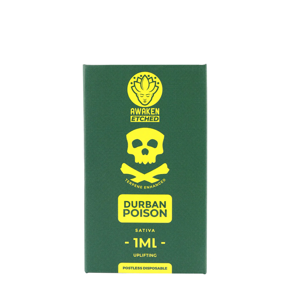 Experience the legendary Durban Poison with this premium disposable vape. This pure Sativa delivers an energizing cerebral uplift and focus with a unique flavour of spicy pine and sweet spearmint. The Awaken Etched device features a dual airway system and an embedded ceramic coil for rich flavour, plus a USB-C charging port and an LED battery display for convenience.